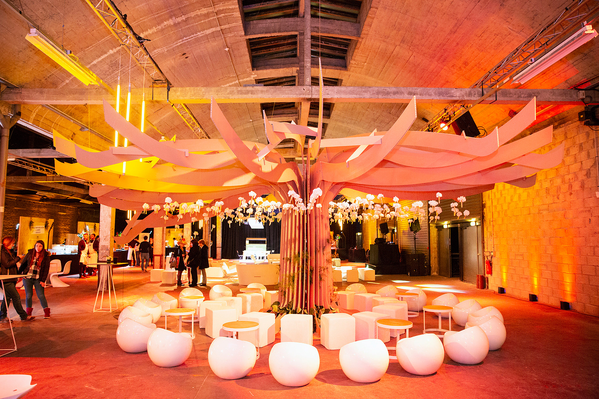 Aménagement de l'espace avec des zones d'exposition, d'animation et surtout la conception d'un arbre en carton grandeur réelle (fabriqué par BREEN).